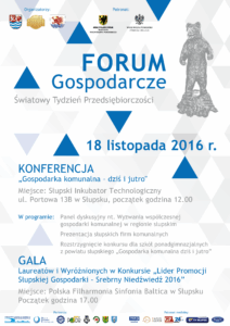 W imieniu Słupskiej Izby Przemysłowo-Handlowej, Miejskiego Zakładu Komunikacji w Słupsku, Przedsiębiorstwa Gospodarki Komunalnej w Słupsku, ENGIE Energetyki Cieplnej Słupsk oraz „Wodociągów Słupsk” mam przyjemność zaprosić na FORUM GOSPODARCZE SŁUPSK 2016 – GOSPODARKA KOMUNALNA DZIŚ I JUTRO. Zapraszamy 18 listopada (piątek) o godz. 12:00 do Słupskiego Inkubatora Technologicznego przy ul. Portowej 13 B w Słupsku.