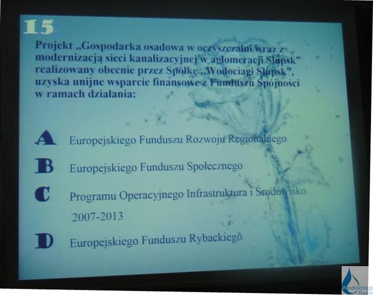 19 marca 2015 w Centrum Edukacji Ekologicznej „Wodociągów Słupsk” odbył się zorganizowany przez Spółkę i Zespół Szkół Agrotechnicznych w Słupsku finał XII edycji konkursu ekologicznego dla uczniów szkół ponadgimnazjalnych „Teraz Woda” – „Myśleć o świecie, działać w powiecie – racjonalne korzystanie z zasobów natury”. W konkursie wzięło udział sześć czteroosobowych zespołów ze słupskich szkół.