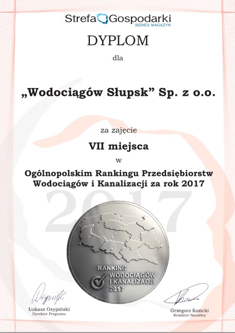 ”Wodociągi Słupsk” Sp. z o.o. zajęły 7. lokatę w Ogólnopolskim Rankingu Najlepszych Przedsiębiorstw Wodociągów i Kanalizacji organizowanym przez niezależny dodatek „Strefa Gospodarki”, dystrybuowanym wraz z Dziennikiem Gazeta Prawna. Ranking ukazał w dodatku z dnia 27 marca.